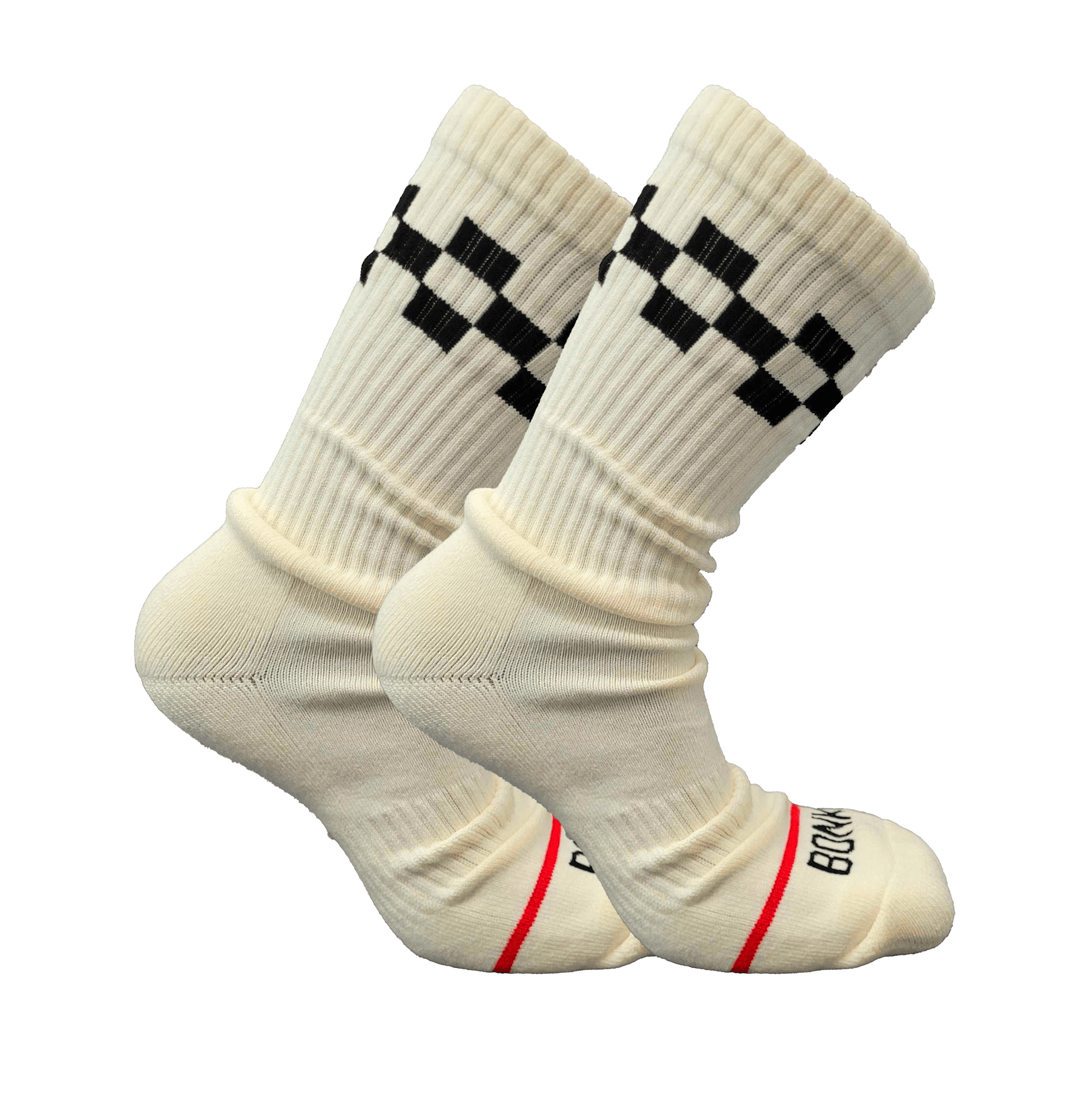 Elevate your sock game with Bonk Cushioned Socks, designed for ultimate comfort and standout style. Made from a premium blend of 80% cotton, 17% polyester, and 3% spandex, these off-white socks offer exceptional softness, breathability, and a perfect fit. The upper cuff features a stylish black checkered pattern, while the toe box is adorned with a bold Bonk red band, adding a unique and edgy touch.