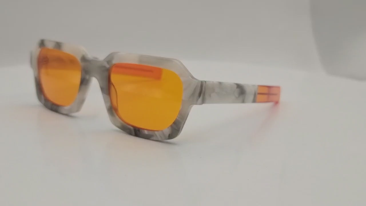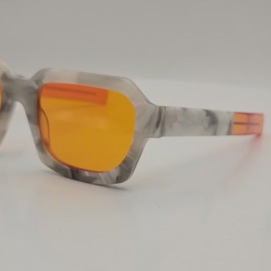 The marbled black, white, and grey tortoise frame creates a unique and eye-catching pattern, ensuring each pair is one-of-a-kind. The vivid orange lenses add a vibrant pop of color, while the orange accent caps on the ends of the handles tie the look together with a playful yet sophisticated touch.